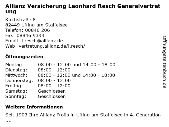 1 Allianz Versicherung Peter Haslberger Generalvertretung (Entfernung: 5,45 km) Johannisstraße 5, 82418 Murnau am Staffelsee 4 Allianz Versicherung Thomas Gewald Generalvertretung (Entfernung: 5,82 km) Ringstraße 4, 82386 Huglfing 6 |