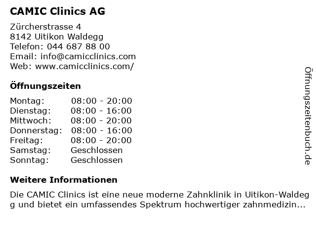 | Öffnungszeiten CAMIC Clinics AG in Uitikon Waldegg anzeigen | |