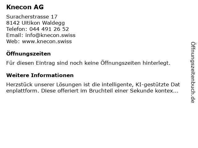 | Öffnungszeiten Knecon AG in Uitikon Waldegg anzeigen | |
