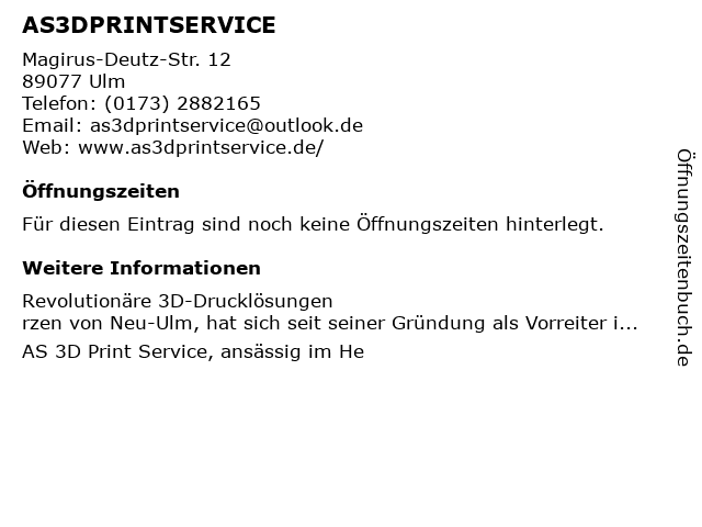 | Öffnungszeiten AS3DPRINTSERVICE in Ulm anzeigen | |