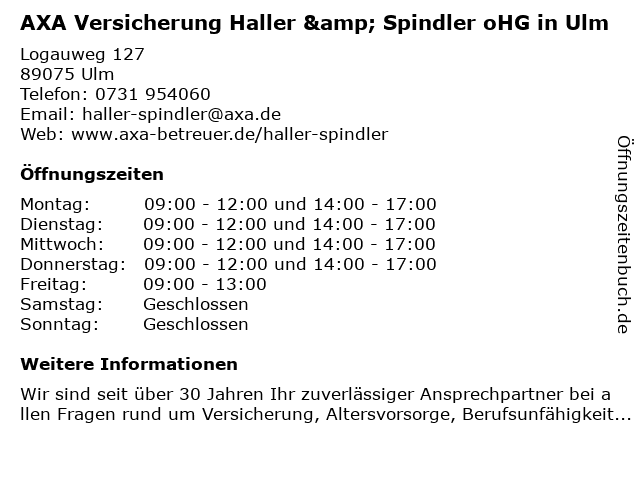 1 DBV Deutsche Beamtenversicherung Haller & Spindler oHG in Ulm (Entfernung: 0,00 km) Logauweg 127, 89075 Ulm 3 AXA Versicherung - Regionalvertretung Siegfried Meicher (Entfernung: 2,06 km) Schillerstr. 29, 89134 Blaustein 4 Nantscheff + Haller Agentur für Marketing, Beratung und Werbung GmbH (Entfernung: 2,19 km) Römerstraße 21, 89077 Ulm 6 |