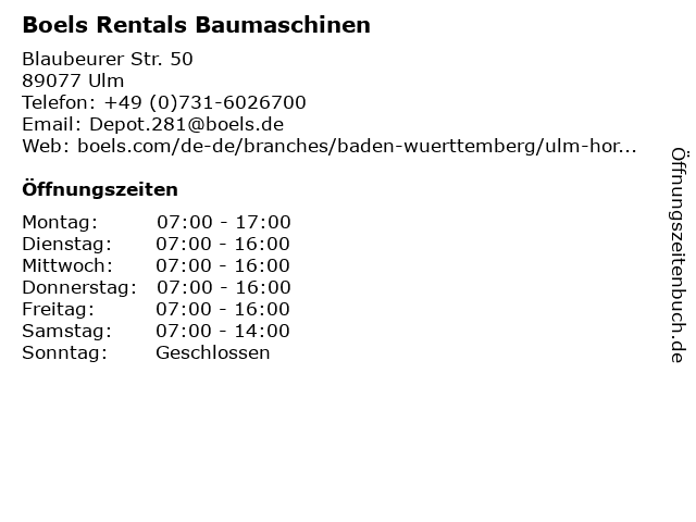 | Öffnungszeiten Boels Rentals Baumaschinen in Ulm anzeigen | |
