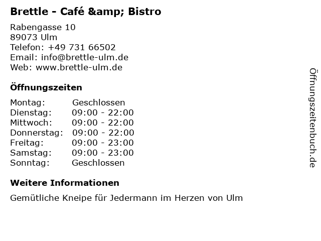 | Öffnungszeiten Brettle - Café & Bistro in Ulm anzeigen | |