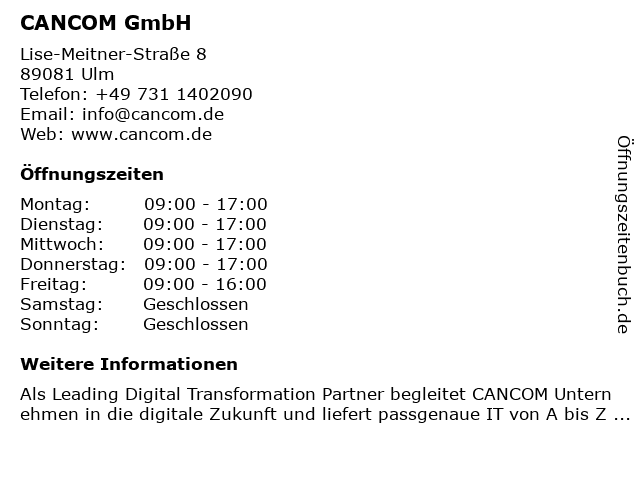 | Öffnungszeiten CANCOM GmbH in Ulm anzeigen | |