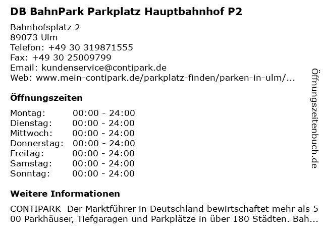 1 DB BahnPark Parkplatz Hauptbahnhof Kurzzeitparkplatz P1 (Entfernung: 0,20 km) Bahnhofsplatz 1, 89073 Ulm 6 |