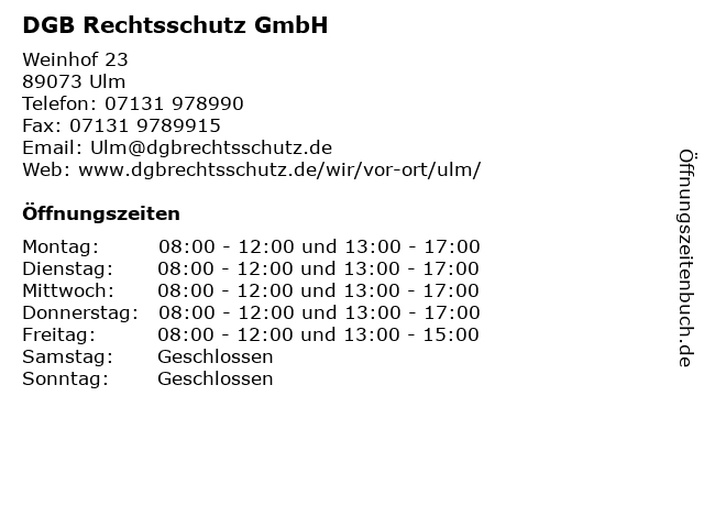 Öffnungszeiten DGB Rechtsschutz GmbH in Ulm anzeigen | |