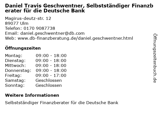 Branchen & Suchbegriffe zu Daniel Travis Geschwentner, Selbstständiger Finanzberater für die Deutsche Bank:bank, daniel, deutsche, finanzberater, geschwentner, selbstständiger, travis |