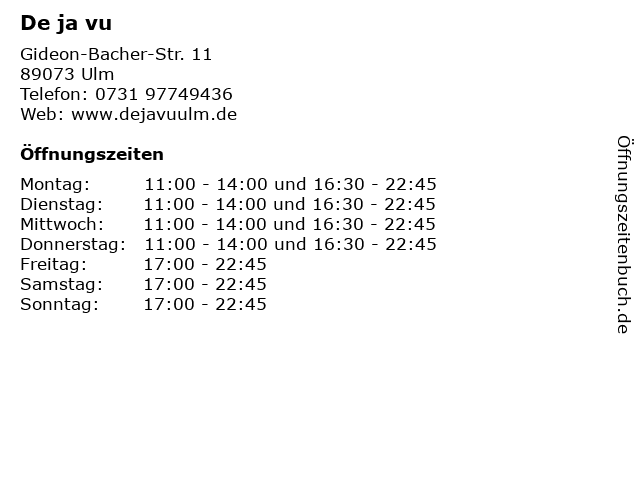 | Öffnungszeiten De ja vu in Ulm anzeigen | |