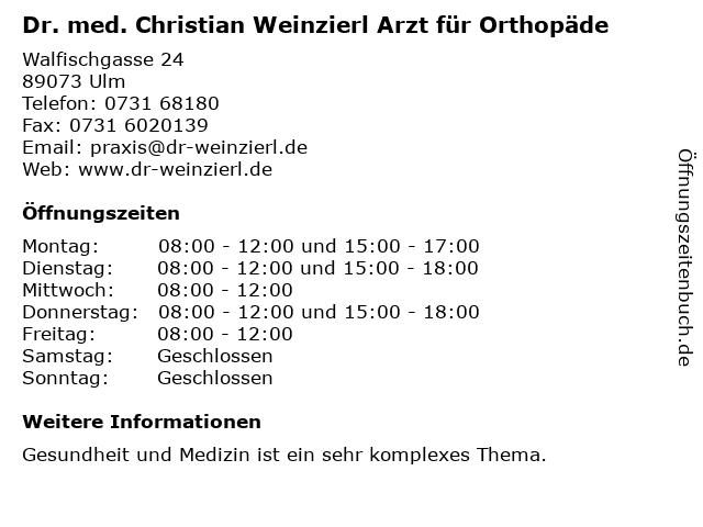 Branchen & Suchbegriffe zu Dr. med. Christian Weinzierl Arzt für Orthopäde:allgemeinärzte, arzt, christian, dr., med., orthopäde, weinzierl |