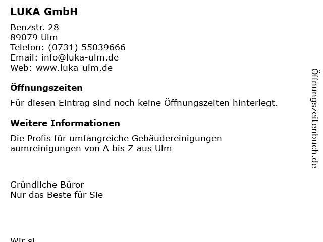 | Öffnungszeiten LUKA GmbH in Ulm anzeigen | |