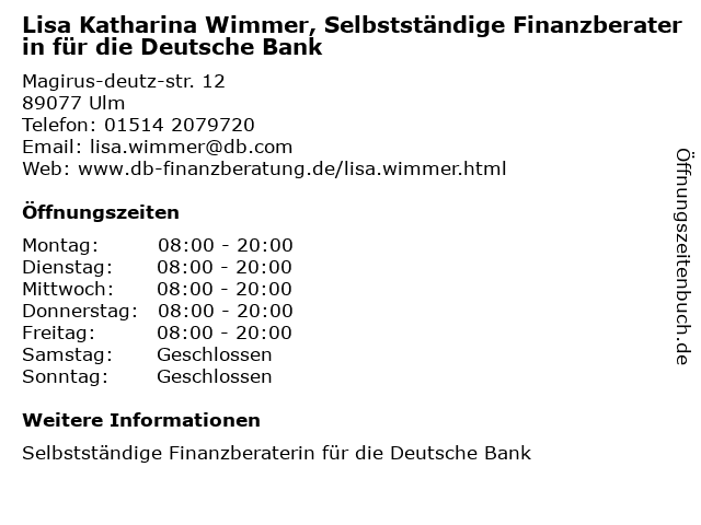 Branchen & Suchbegriffe zu Lisa Katharina Wimmer, Selbstständige Finanzberaterin für die Deutsche Bank:bank, deutsche, finanzberaterin, katharina, lisa, selbstständige, wimmer |