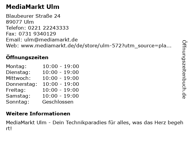 | Öffnungszeiten MediaMarkt Ulm in Ulm anzeigen | |