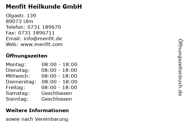 | Öffnungszeiten Menfit Heilkunde GmbH in Ulm anzeigen | |