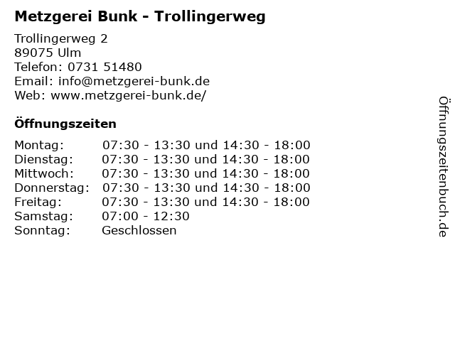 | Öffnungszeiten Metzgerei Bunk - Trollingerweg in Ulm anzeigen | |