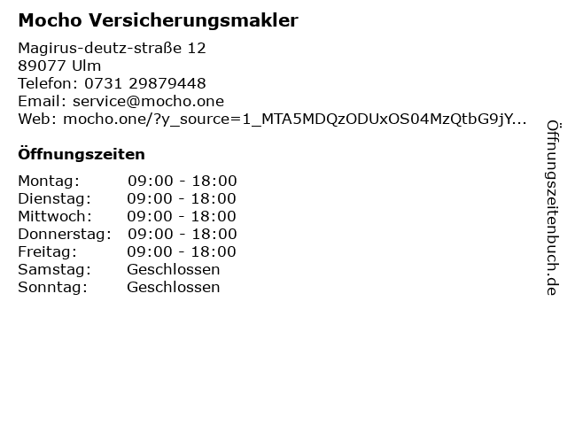 | Öffnungszeiten Mocho Versicherungsmakler in Ulm anzeigen | |