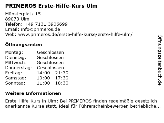 | Öffnungszeiten PRIMEROS Erste-Hilfe-Kurs Ulm in Ulm anzeigen | |