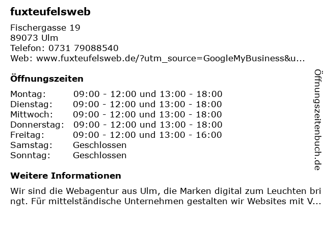 | Öffnungszeiten fuxteufelsweb in Ulm anzeigen | |