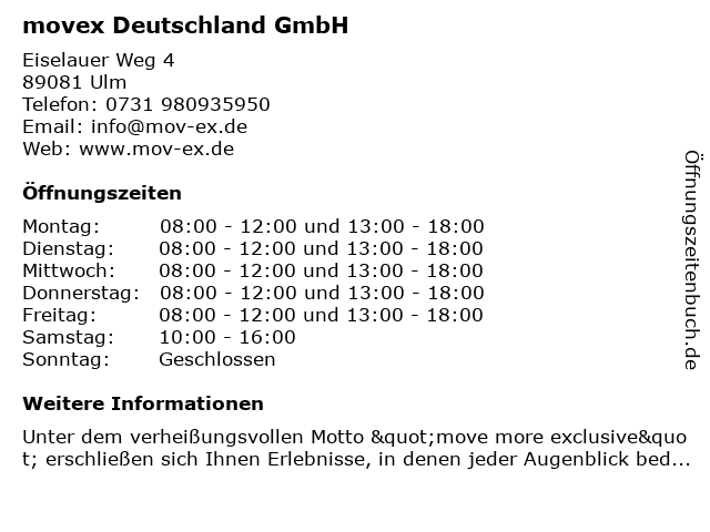 | Öffnungszeiten movex Deutschland GmbH in Ulm anzeigen | |