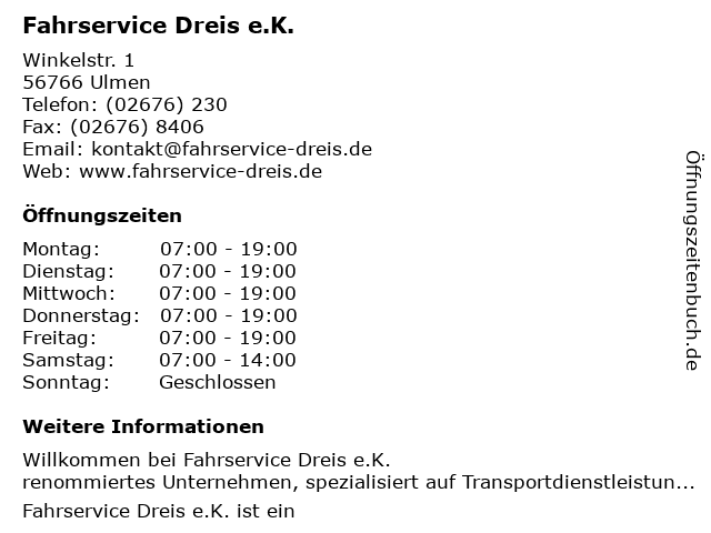 | Öffnungszeiten Fahrservice Dreis e.K. in Ulmen anzeigen | |