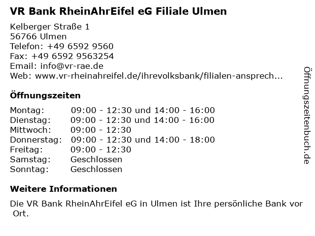 2 Volksbank RheinAhrEifel eG, SB Filiale Center Parcs Park Eifel (Entfernung: 4,71 km) Am Kurberg 10, 56767 Gunderath 6 VR Bank RheinAhrEifel eG Filiale Gillenfeld (Entfernung: 10,83 km) Pulvermaarstraße 2, 54558 Gillenfeld |