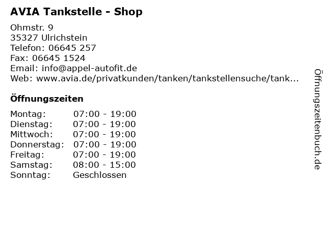 | Öffnungszeiten AVIA Tankstelle - Shop in Ulrichstein anzeigen | |