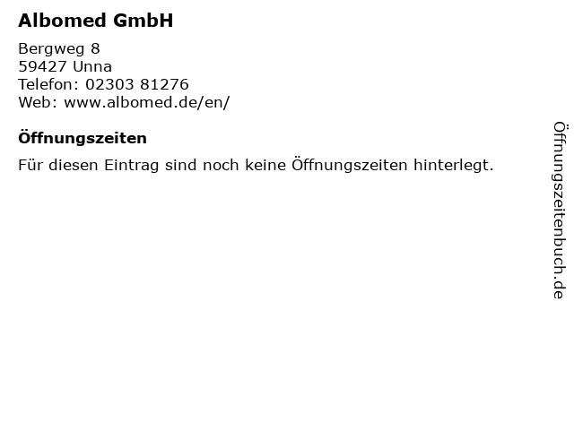 | Öffnungszeiten Albomed GmbH in Unna anzeigen | |