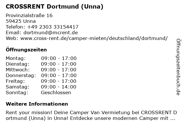 | Öffnungszeiten CROSSRENT Dortmund (Unna) in Unna anzeigen | |