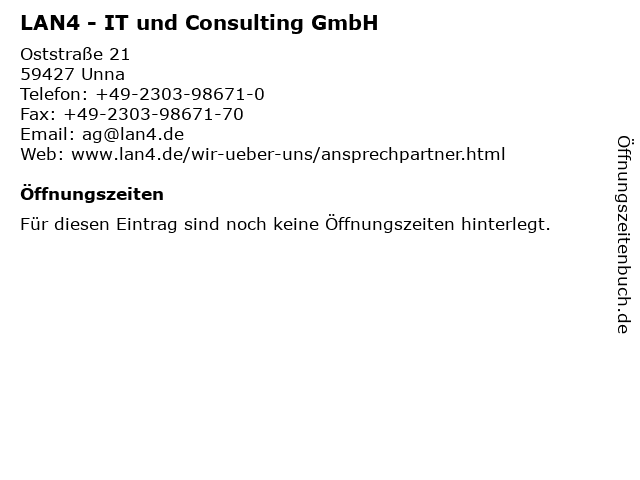 | Öffnungszeiten LAN4 - IT und Consulting GmbH in Unna anzeigen | |