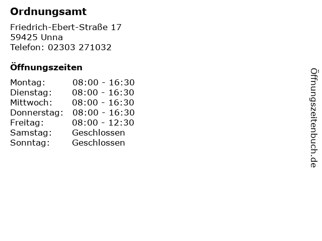 | Öffnungszeiten Ordnungsamt in Unna anzeigen | |