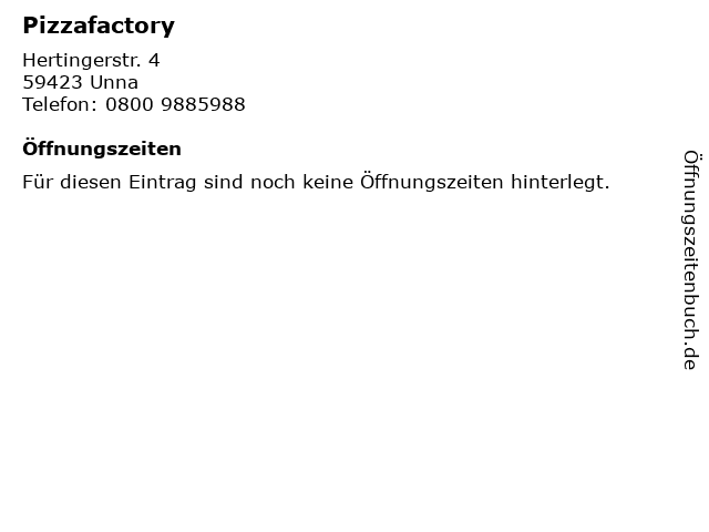 | Öffnungszeiten Pizzafactory in Unna anzeigen | |