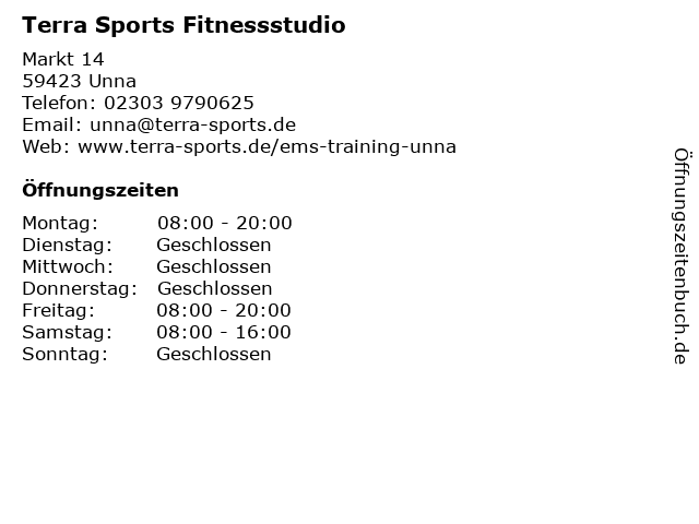 | Öffnungszeiten Terra Sports Fitnessstudio in Unna anzeigen | |