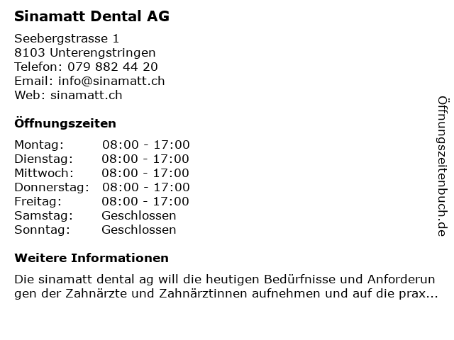 | Öffnungszeiten Sinamatt Dental AG in Unterengstringen anzeigen | |