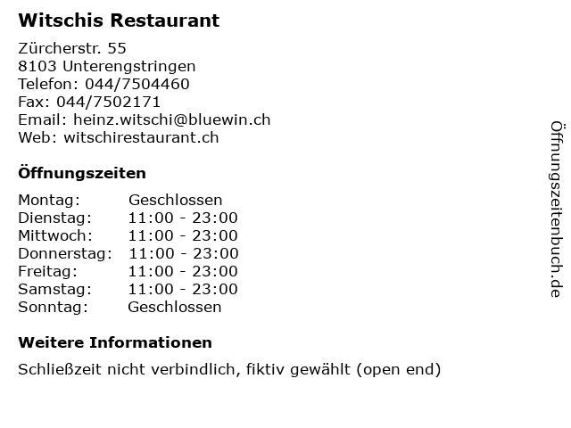 | Öffnungszeiten Witschis Restaurant in Unterengstringen anzeigen | |