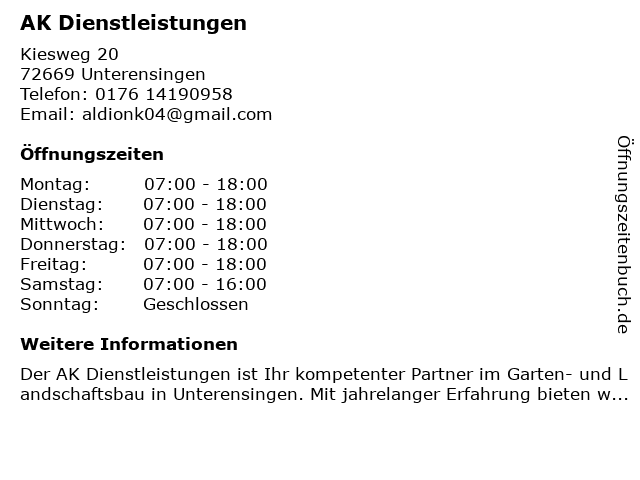 | Öffnungszeiten AK Dienstleistungen in Unterensingen anzeigen | |