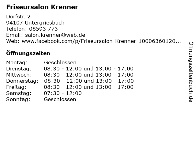| Öffnungszeiten Friseursalon Krenner in Untergriesbach anzeigen | |