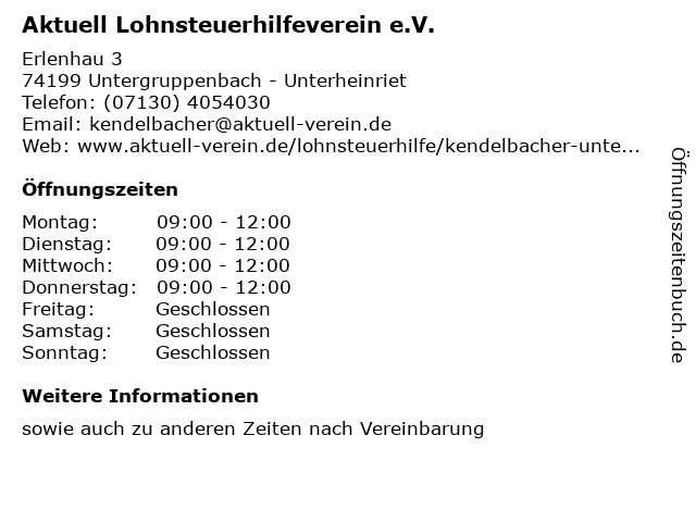 Öffnungszeiten Aktuell Lohnsteuerhilfeverein e.V. in Untergruppenbach - Unterheinriet anzeigen