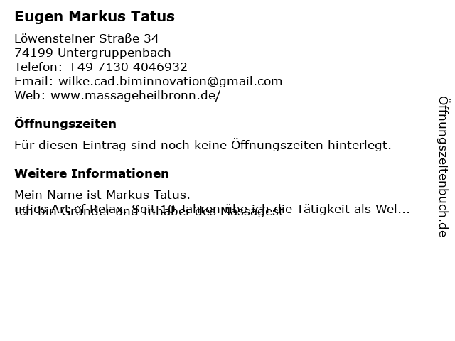| Öffnungszeiten Eugen Markus Tatus in Untergruppenbach anzeigen | |