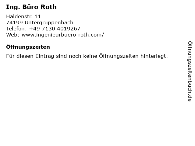 | Öffnungszeiten Ing. Büro Roth in Untergruppenbach anzeigen | |