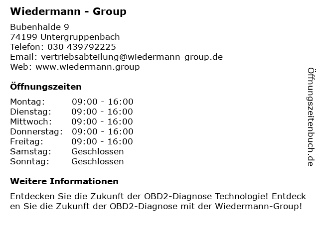 | Öffnungszeiten Wiedermann - Group in Untergruppenbach anzeigen | |