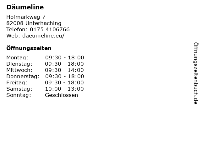 | Öffnungszeiten Däumeline in Unterhaching anzeigen | |