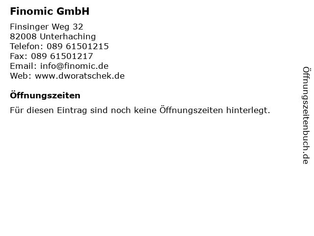 | Öffnungszeiten Finomic GmbH in Unterhaching anzeigen | |