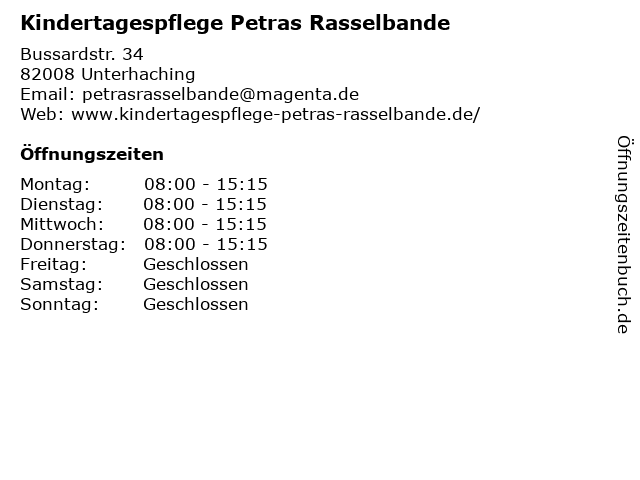 Öffnungszeiten Kindertagespflege Petras Rasselbande in Unterhaching anzeigen | |