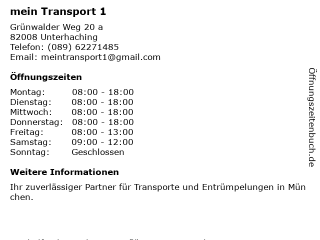 | Öffnungszeiten mein Transport 1 in Unterhaching anzeigen | |