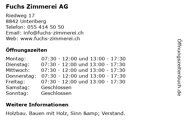 | Öffnungszeiten Fuchs Zimmerei AG in Unteriberg anzeigen | |