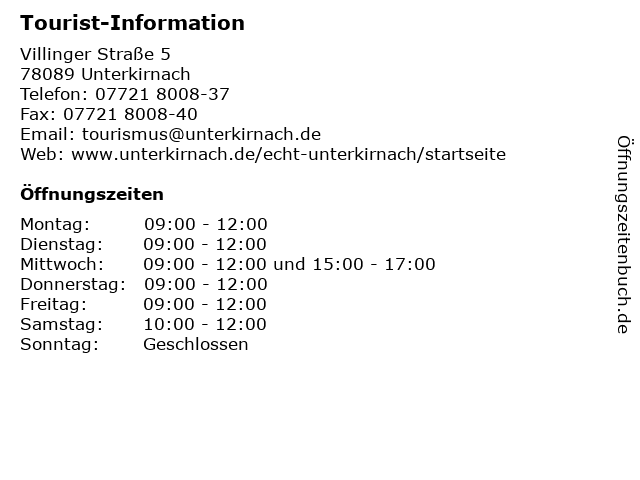 | Öffnungszeiten Tourist-Information in Unterkirnach anzeigen | |