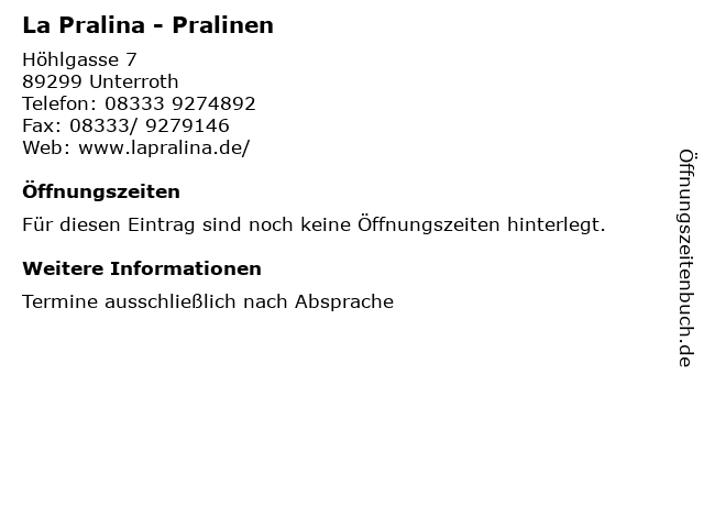 | Telefonnummer La Pralina - Pralinen in Unterroth (08333 9274892) anrufen | |