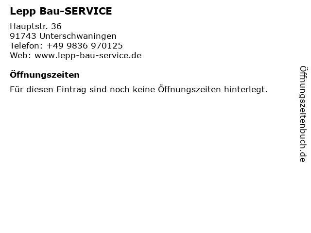| Öffnungszeiten Lepp Bau-SERVICE in Unterschwaningen anzeigen | |