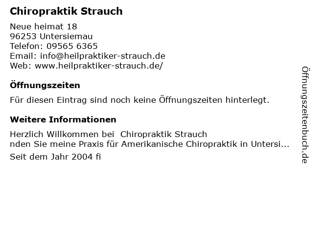 | Öffnungszeiten Chiropraktik Strauch in Untersiemau anzeigen | |