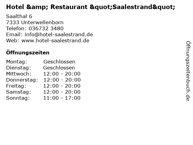 1 Hotel & Restaurant Saalestrand - Öffnungszeiten Restaurant (Entfernung: 0,01 km) Saalthal 6, 07333 Unterwellenborn 6 |