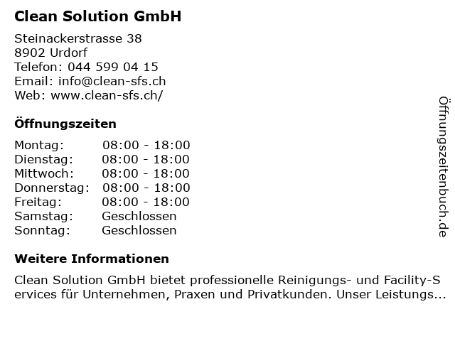 | Öffnungszeiten Clean Solution GmbH in Urdorf anzeigen | |